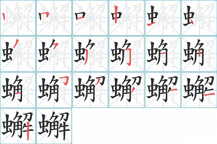 蠏是左右结构,蠏的部首是“虫”,部外笔画13画,总笔画19画,蠏的笔画顺序是“竖、横折、横、竖、横、点、撇、横撇/横钩、撇、横折钩、横、横、竖、横折钩、撇、撇、横、横、竖”。看看“蠏”字什么意思 >>