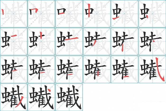 蠘是左右结构,蠘的部首是“虫”,部外笔画14画,总笔画20画,蠘的笔画顺序是“竖、横折、横、竖、横、点、横、竖、横、撇、竖、点、横、横、横、竖、横、斜钩、撇、点”。看看“蠘”字什么意思 >>