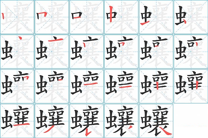 蠰是左右结构,蠰的部首是“虫”,部外笔画17画,总笔画23画,蠰的笔画顺序是“竖、横折、横、竖、横、点、点、横、竖、横折、横、竖、横折、横、横、横、竖、竖、横、撇、竖提、撇、捺”。看看“蠰”字什么意思 >>