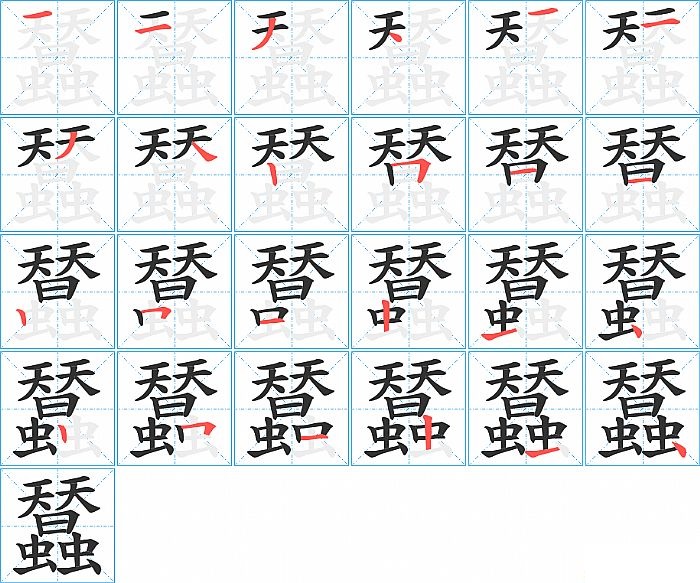 蠺是上中下结构,蠺的部首是“虫”,部外笔画18画,总笔画24画,蠺的笔画顺序是“横、横、撇、点、横、横、撇、捺、竖、横折、横、横、竖、横折、横、竖、横、点、竖、横折、横、竖、横、点”。看看“蠺”字什么意思 >>