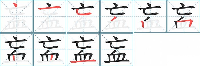 衁是上下结构,衁的部首是“血”,部外笔画3画,总笔画9画,衁的笔画顺序是“点、横、竖折/竖弯、撇、竖、横折、竖、竖、横”。