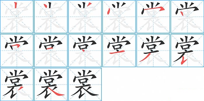 裳是上下结构,裳的部首是“衣”,部外笔画8画,总笔画14画,裳的笔画顺序是“竖、点、撇、点、横撇/横钩、竖、横折、横、点、横、撇、竖提、撇、捺”。看看“裳”字什么意思 >>
