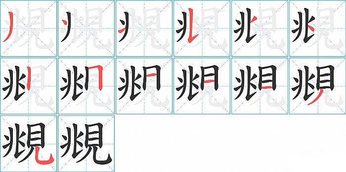 覜是左右结构,覜的部首是“見”,部外笔画6画,总笔画13画,覜的笔画顺序是“撇、点、提、竖提、撇、点、竖、横折、横、横、横、撇、竖弯钩”。看看“覜”字什么意思 >>