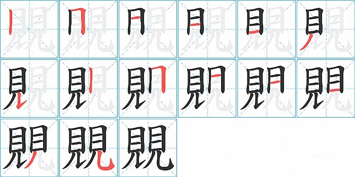 覞是左右结构,覞的部首是“見”,部外笔画7画,总笔画14画,覞的笔画顺序是“竖、横折、横、横、横、撇、竖提、竖、横折、横、横、横、撇、竖弯钩”。看看“覞”字什么意思 >>