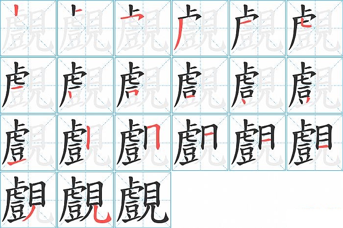 覻是左右结构,覻的部首是“見”,部外笔画13画,总笔画20画,覻的笔画顺序是“竖、横、横撇/横钩、撇、横、竖弯钩、横、竖、横折、横、点、撇、提、竖、横折、横、横、横、撇、竖弯钩”。看看“覻”字什么意思 >>