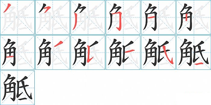 觝是左右结构,觝的部首是“角”,部外笔画5画,总笔画12画,觝的笔画顺序是“撇、横撇/横钩、撇、横折钩、横、横、竖、撇、竖提、横、斜钩、点”。看看“觝”字什么意思 >>