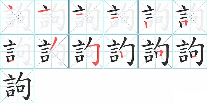 訽是左右结构,訽的部首是“言”,部外笔画5画,总笔画12画,訽的笔画顺序是“点、横、横、横、竖、横折、横、撇、横折钩、竖、横折、横”。看看“訽”字什么意思 >>