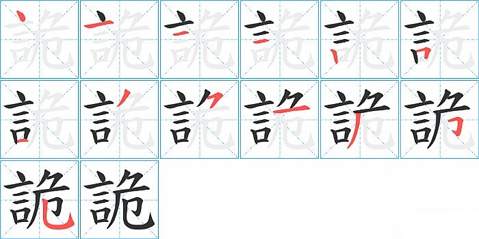 詭是左右结构,詭的部首是“言”,部外笔画6画,总笔画13画,詭的笔画顺序是“点、横、横、横、竖、横折、横、撇、横撇/横钩、横、撇、横折钩、竖弯钩”。看看“詭”字什么意思 >>