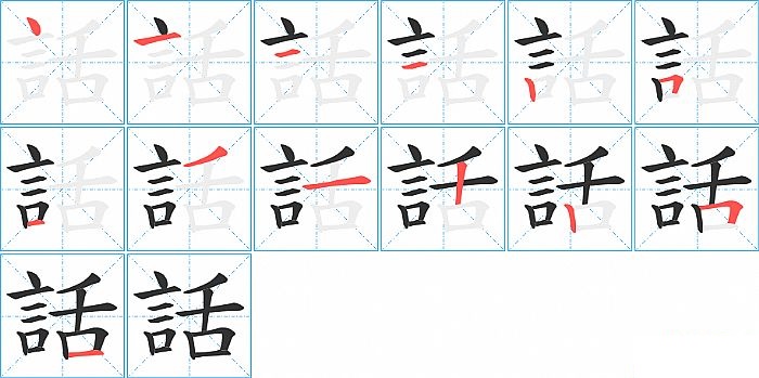 話是左右结构,話的部首是“言”,部外笔画6画,总笔画13画,話的笔画顺序是“点、横、横、横、竖、横折、横、撇、横、竖、竖、横折、横”。看看“話”字什么意思 >>