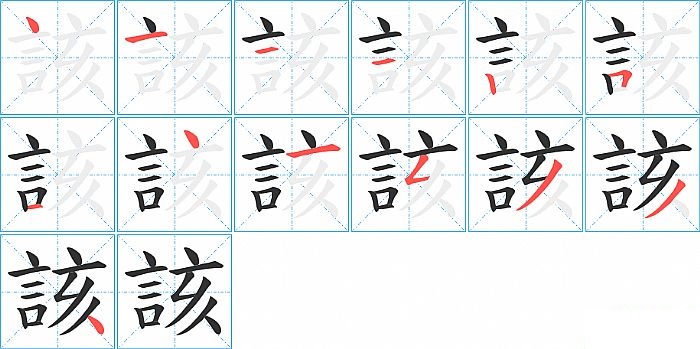 該是左右结构,該的部首是“言”,部外笔画6画,总笔画13画,該的笔画顺序是“点、横、横、横、竖、横折、横、点、横、撇折、撇、撇、点”。看看“該”字什么意思 >>