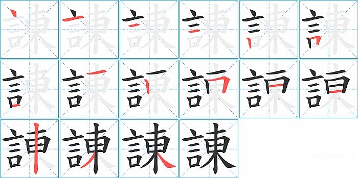 諌是左右结构,諌的部首是“言”,部外笔画8画,总笔画15画,諌的笔画顺序是“点、横、横、横、竖、横折、横、横、竖、横折、横、横、竖、撇、捺”。看看“諌”字什么意思 >>