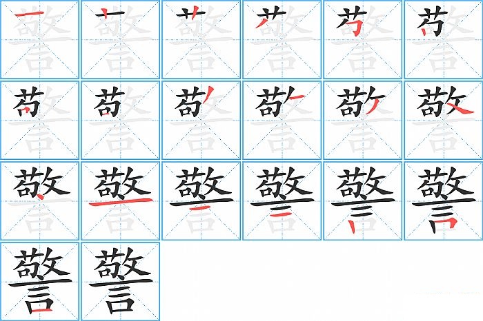 警是上下结构,警的部首是“言”,部外笔画12画,总笔画19画,警的笔画顺序是“横、竖、竖、撇、横折钩、竖、横折、横、撇、横、撇、捺、点、横、横、横、竖、横折、横”。看看“警”字什么意思 >>