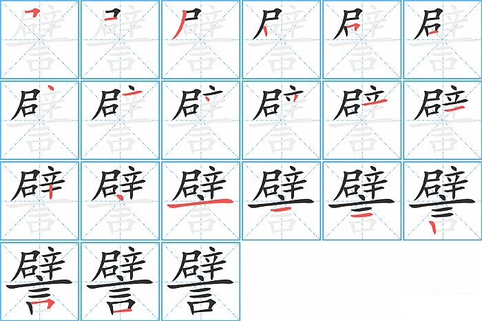 譬是上下结构,譬的部首是“言”,部外笔画13画,总笔画20画,譬的笔画顺序是“横折、横、撇、竖、横折、横、点、横、点、撇、横、横、竖、点、横、横、横、竖、横折、横”。看看“譬”字什么意思 >>