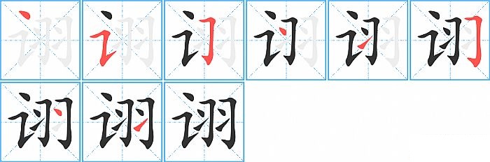诩是左右结构,诩的部首是“讠”,部外笔画6画,总笔画8画,诩的笔画顺序是“点、横折提、横折钩、点、提、横折钩、点、提”。