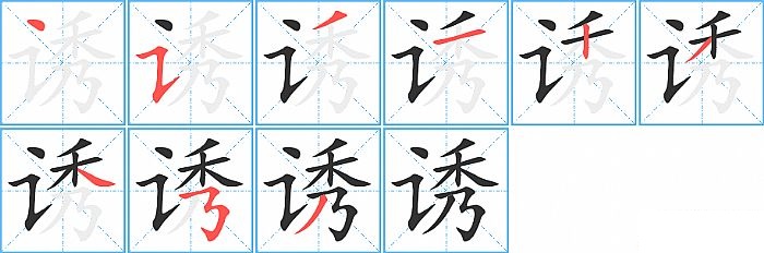 诱是左右结构,诱的部首是“讠”,部外笔画7画,总笔画9画,诱的笔画顺序是“点、横折提、撇、横、竖、撇、捺、横折折折钩/横撇弯钩、撇”。看看“诱”字什么意思 >>