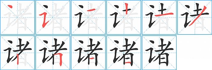 诸是左右结构,诸的部首是“讠”,部外笔画8画,总笔画10画,诸的笔画顺序是“点、横折提、横、竖、横、撇、竖、横折、横、横”。看看“诸”字什么意思 >>