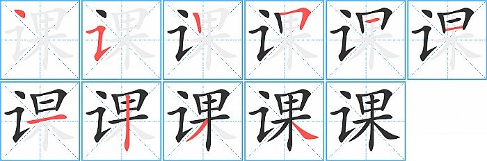 课是左右结构,课的部首是“讠”,部外笔画8画,总笔画10画,课的笔画顺序是“点、横折提、竖、横折、横、横、横、竖、撇、捺”。看看“课”字什么意思 >>
