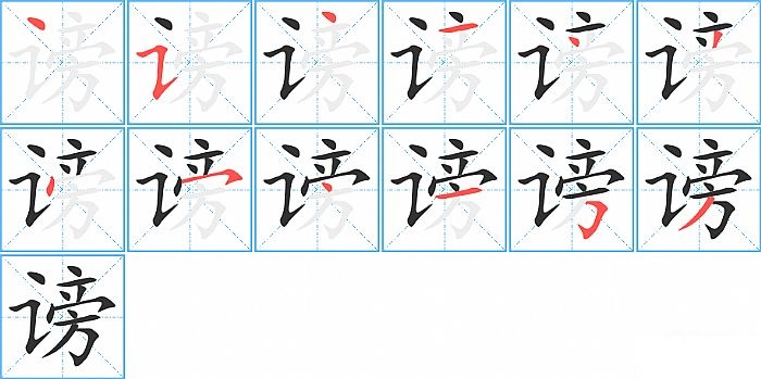 谤是左右结构,谤的部首是“讠”,部外笔画10画,总笔画12画,谤的笔画顺序是“点、横折提、点、横、点、撇、点、横撇/横钩、点、横、横折钩、撇”。看看“谤”字什么意思 >>