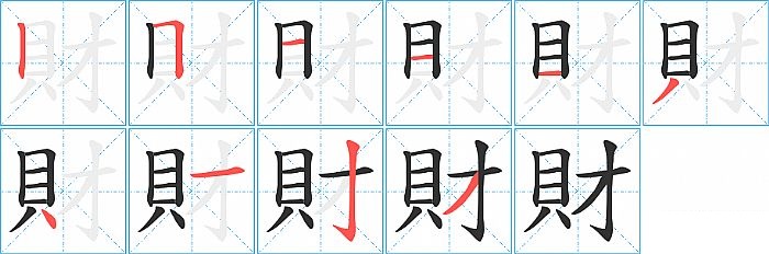 財是左右结构,財的部首是“貝”,部外笔画3画,总笔画10画,財的笔画顺序是“竖、横折、横、横、横、撇、点、横、竖钩、撇”。