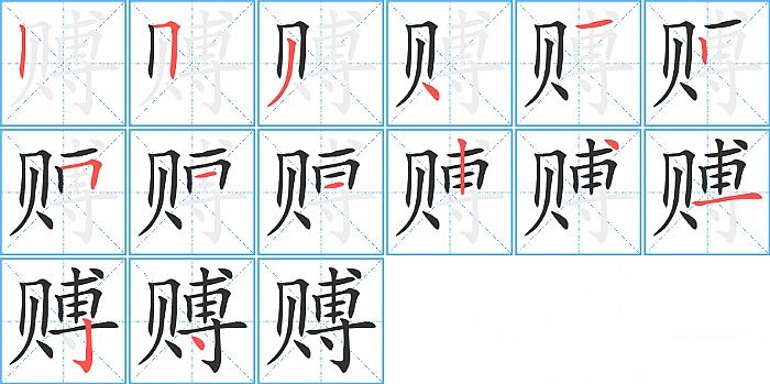 赙是左右结构,赙的部首是“贝”,部外笔画10画,总笔画14画,赙的笔画顺序是“竖、横折、撇、点、横、竖、横折、横、横、竖、点、横、竖钩、点”。看看“赙”字什么意思 >>