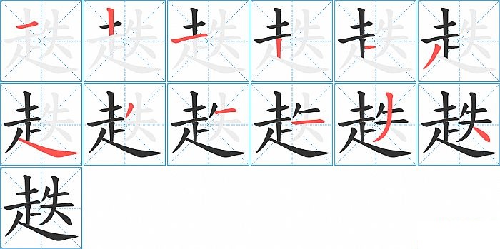 趃是左下包围结构,趃的部首是“走”,部外笔画5画,总笔画12画,趃的笔画顺序是“横、竖、横、竖、横、撇、捺、撇、横、横、撇、点”。看看“趃”字什么意思 >>
