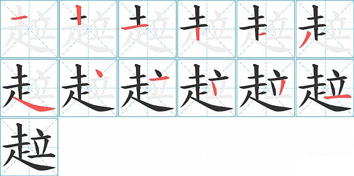 趇是左下包围结构,趇的部首是“走”,部外笔画5画,总笔画12画,趇的笔画顺序是“横、竖、横、竖、横、撇、捺、点、横、点、撇、横”。看看“趇”字什么意思 >>
