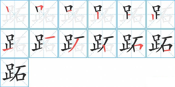跖是左右结构,跖的部首是“足”,部外笔画5画,总笔画12画,跖的笔画顺序是“竖、横折、横、竖、横、竖、提、横、撇、竖、横折、横”。看看“跖”字什么意思 >>