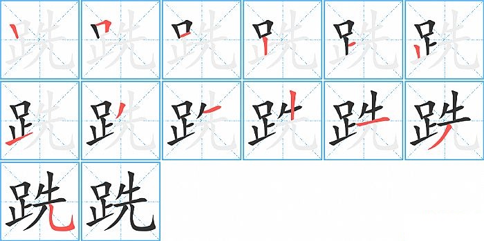 跣是左右结构,跣的部首是“足”,部外笔画6画,总笔画13画,跣的笔画顺序是“竖、横折、横、竖、横、竖、提、撇、横、竖、横、撇、竖弯钩”。看看“跣”字什么意思 >>