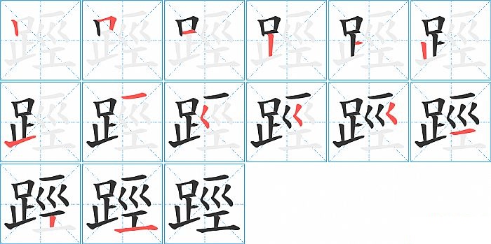 踁是左右结构,踁的部首是“足”,部外笔画7画,总笔画14画,踁的笔画顺序是“竖、横折、横、竖、横、竖、提、横、撇点、撇点、撇点、横、竖、横”。看看“踁”字什么意思 >>