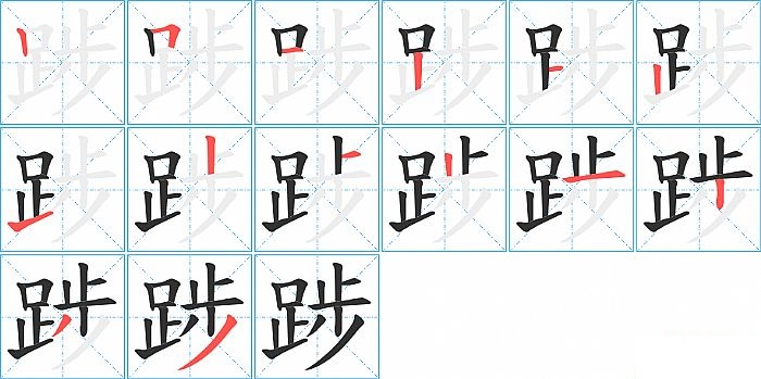 踄是左右结构,踄的部首是“足”,部外笔画7画,总笔画14画,踄的笔画顺序是“竖、横折、横、竖、横、竖、提、竖、横、竖、横、竖、撇、撇”。看看“踄”字什么意思 >>