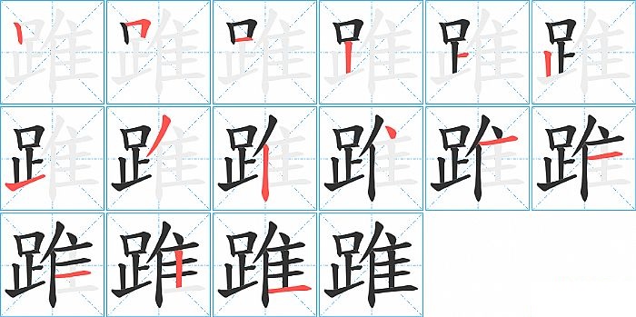 踓是左右结构,踓的部首是“足”,部外笔画8画,总笔画15画,踓的笔画顺序是“竖、横折、横、竖、横、竖、提、撇、竖、点、横、横、横、竖、横”。看看“踓”字什么意思 >>