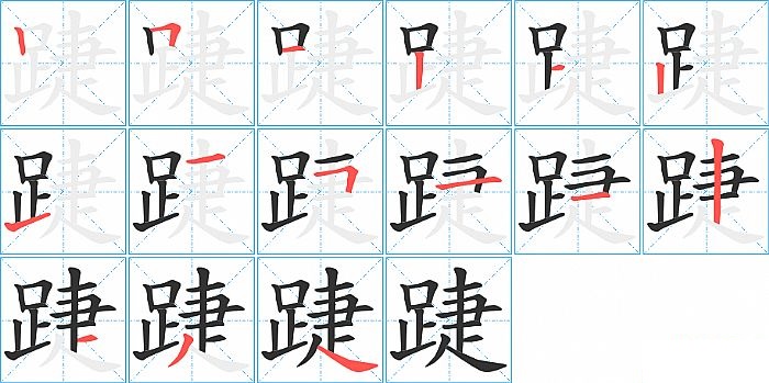 踕是左右结构,踕的部首是“足”,部外笔画8画,总笔画15画,踕的笔画顺序是“竖、横折、横、竖、横、竖、提、横、横折、横、横、竖、横、撇、捺”。看看“踕”字什么意思 >>
