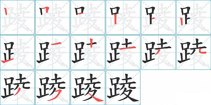 踜是左右结构,踜的部首是“足”,部外笔画8画,总笔画15画,踜的笔画顺序是“竖、横折、横、竖、横、竖、提、横、竖、横、撇、点、撇、横撇/横钩、捺”。看看“踜”字什么意思 >>