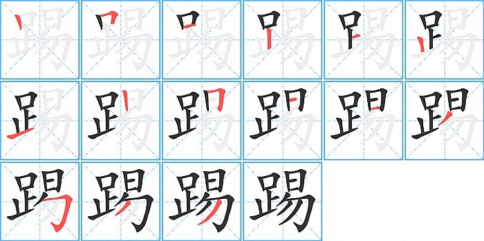 踢是左右结构,踢的部首是“足”,部外笔画8画,总笔画15画,踢的笔画顺序是“竖、横折、横、竖、横、竖、提、竖、横折、横、横、撇、横折钩、撇、撇”。看看“踢”字什么意思 >>
