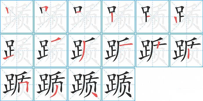 踬是左右结构,踬的部首是“足”,部外笔画8画,总笔画15画,踬的笔画顺序是“竖、横折、横、竖、横、竖、提、撇、撇、横、竖、竖、横折、撇、点”。看看“踬”字什么意思 >>