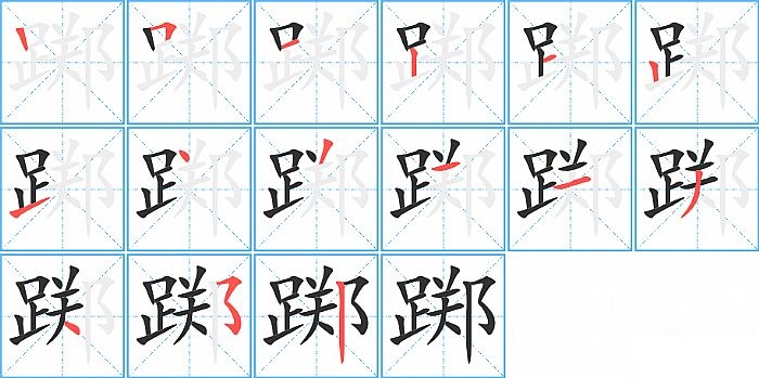 踯是左右结构,踯的部首是“足”,部外笔画8画,总笔画15画,踯的笔画顺序是“竖、横折、横、竖、横、竖、提、点、撇、横、横、撇、点、横折折折钩/横撇弯钩、竖”。看看“踯”字什么意思 >>