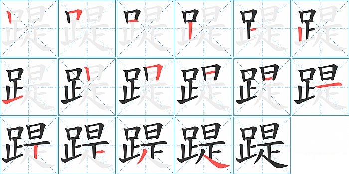 踶是左右结构,踶的部首是“足”,部外笔画9画,总笔画16画,踶的笔画顺序是“竖、横折、横、竖、横、竖、提、竖、横折、横、横、横、竖、横、撇、捺”。看看“踶”字什么意思 >>