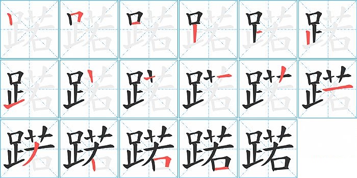 蹃是左右结构,蹃的部首是“足”,部外笔画8画,总笔画15画,蹃的笔画顺序是“竖、横折、横、竖、横、竖、提、横、竖、竖、横、撇、竖、横折、横”。看看“蹃”字什么意思 >>