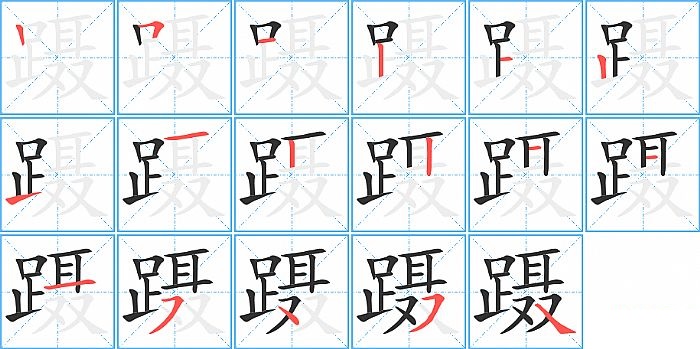 蹑是左右结构,蹑的部首是“足”,部外笔画10画,总笔画17画,蹑的笔画顺序是“竖、横折、横、竖、横、竖、提、横、竖、竖、横、横、横、横撇/横钩、点、横撇/横钩、捺”。看看“蹑”字什么意思 >>