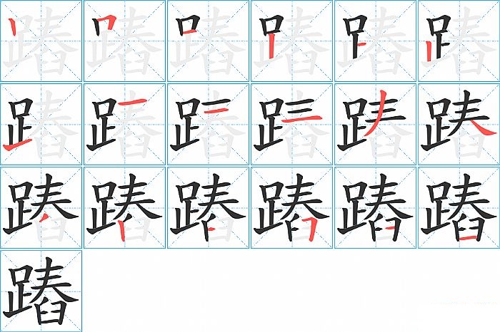 蹖是左右结构,蹖的部首是“足”,部外笔画11画,总笔画18画,蹖的笔画顺序是“竖、横折、横、竖、横、竖、提、横、横、横、撇、捺、撇、竖、横、横折、横、横”。看看“蹖”字什么意思 >>