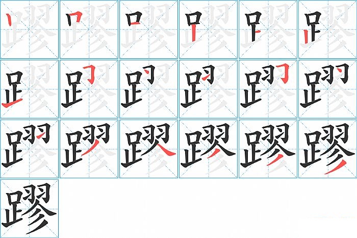 蹘是左右结构,蹘的部首是“足”,部外笔画11画,总笔画18画,蹘的笔画顺序是“竖、横折、横、竖、横、竖、提、横折、点、提、横折、点、提、撇、捺、撇、撇、撇”。看看“蹘”字什么意思 >>