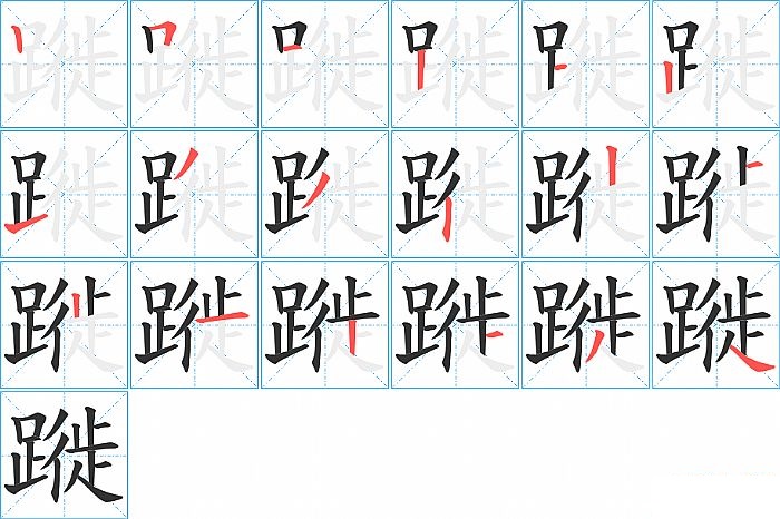蹝是左右结构,蹝的部首是“足”,部外笔画11画,总笔画18画,蹝的笔画顺序是“竖、横折、横、竖、横、竖、提、撇、撇、竖、竖、横、竖、横、竖、横、撇、捺”。看看“蹝”字什么意思 >>