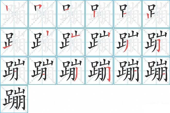 蹦是左右结构,蹦的部首是“足”,部外笔画11画,总笔画18画,蹦的笔画顺序是“竖、横折、横、竖、横、竖、提、竖、竖折/竖弯、竖、撇、横折钩、横、横、撇、横折钩、横、横”。看看“蹦”字什么意思 >>