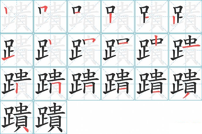 蹪是左右结构,蹪的部首是“足”,部外笔画12画,总笔画19画,蹪的笔画顺序是“竖、横折、横、竖、横、竖、提、竖、横折、横、竖、横、竖、横折、横、横、横、撇、点”。看看“蹪”字什么意思 >>