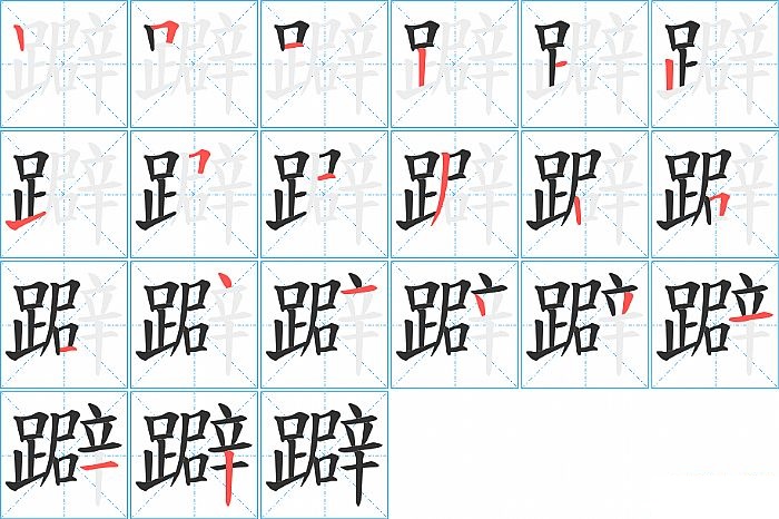 躃是左右结构,躃的部首是“足”,部外笔画13画,总笔画20画,躃的笔画顺序是“竖、横折、横、竖、横、竖、提、横折、横、撇、竖、横折、横、点、横、点、撇、横、横、竖”。看看“躃”字什么意思 >>