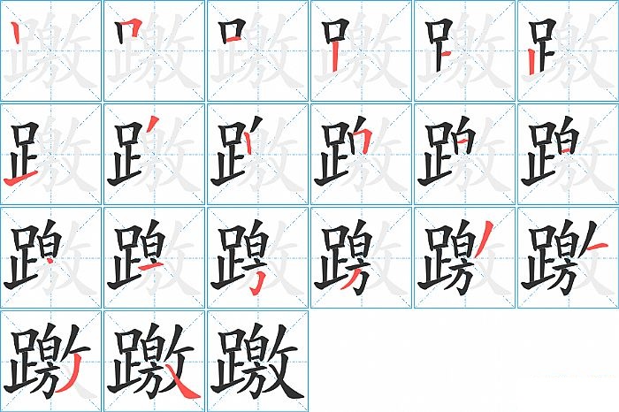 躈是左右结构,躈的部首是“足”,部外笔画13画,总笔画20画,躈的笔画顺序是“竖、横折、横、竖、横、竖、提、撇、竖、横折、横、横、点、横、横折钩、撇、撇、横、撇、捺”。看看“躈”字什么意思 >>
