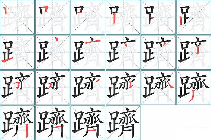 躋是左右结构,躋的部首是“足”,部外笔画14画,总笔画21画,躋的笔画顺序是“竖、横折、横、竖、横、竖、提、点、横、点、撇、竖、横折钩、撇、撇、竖提、捺、撇、竖、横、横”。看看“躋”字什么意思 >>