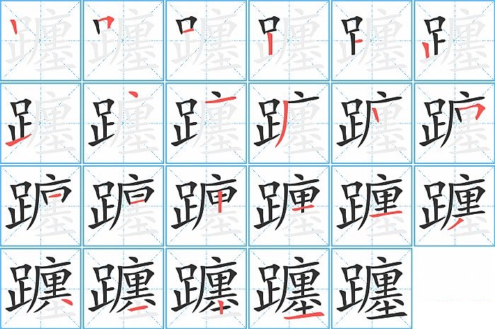 躔是左右结构,躔的部首是“足”,部外笔画15画,总笔画22画,躔的笔画顺序是“竖、横折、横、竖、横、竖、提、点、横、撇、竖、横折、横、横、竖、横、横、撇、点、横、竖、横”。看看“躔”字什么意思 >>
