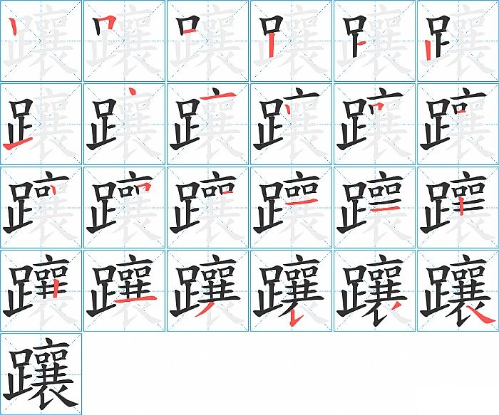 躟是左右结构,躟的部首是“足”,部外笔画17画,总笔画24画,躟的笔画顺序是“竖、横折、横、竖、横、竖、提、点、横、竖、横折、横、竖、横折、横、横、横、竖、竖、横、撇、竖提、撇、捺”。看看“躟”字什么意思 >>