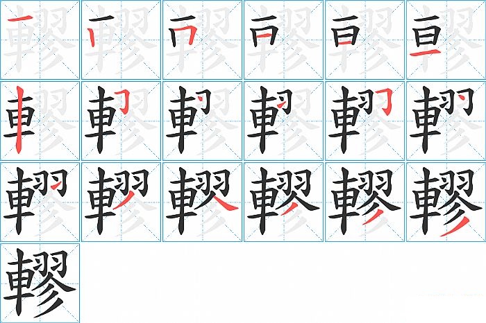 轇是左右结构,轇的部首是“車”,部外笔画11画,总笔画18画,轇的笔画顺序是“横、竖、横折、横、横、横、竖、横折、点、提、横折、点、提、撇、捺、撇、撇、撇”。看看“轇”字什么意思 >>